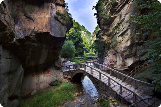 這條峽谷俗稱轱轆峪,窈窕峽長(zhǎng)蜿蜒曲折,峪谷兩壁陡峭奇聳,峰巒疊嶂。從頭到尾,處處新穎,決無(wú)重復(fù)之感,一進(jìn)潭頭,就把游人引入到瓊山閑境,使人心礦神怡,欣然前往。